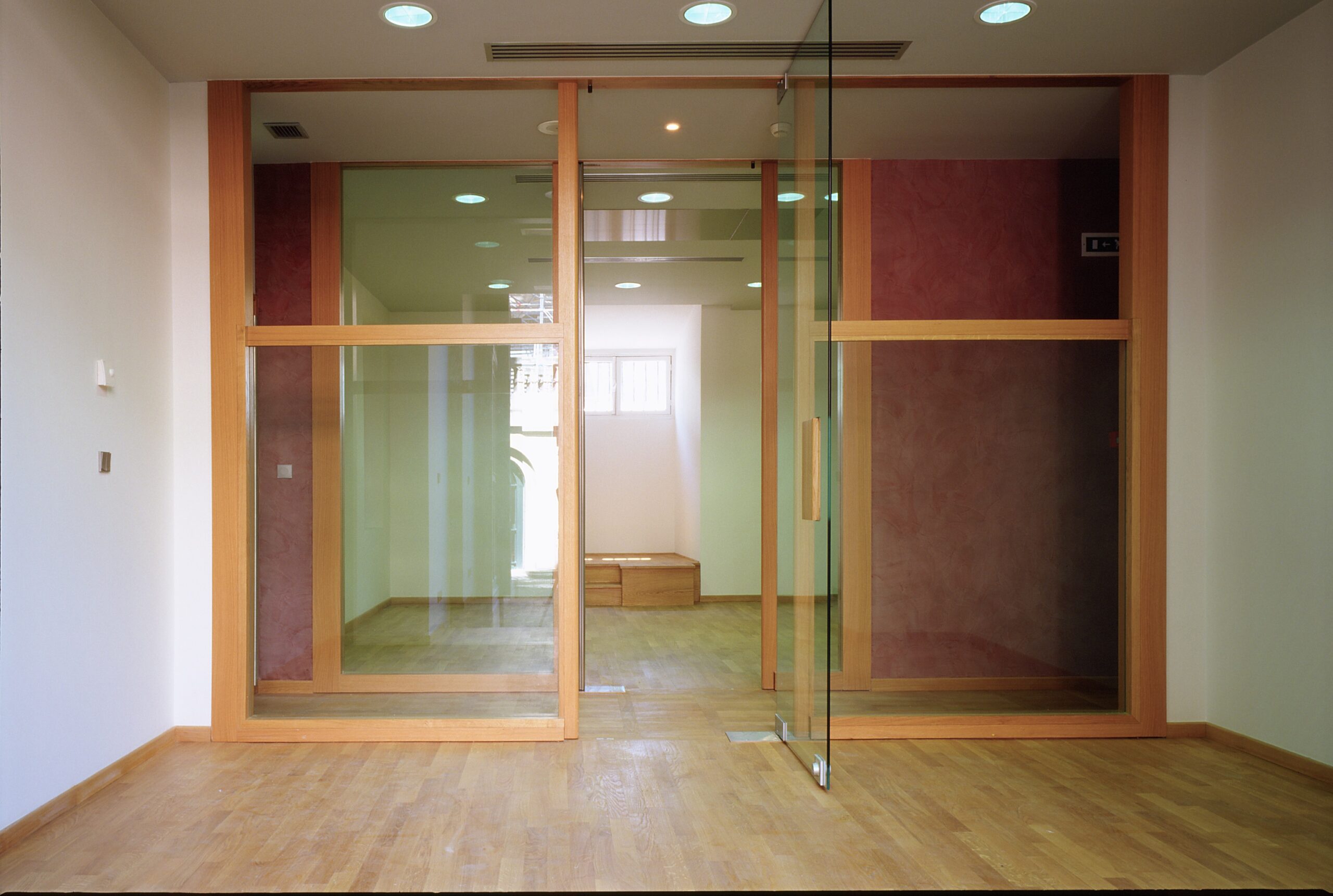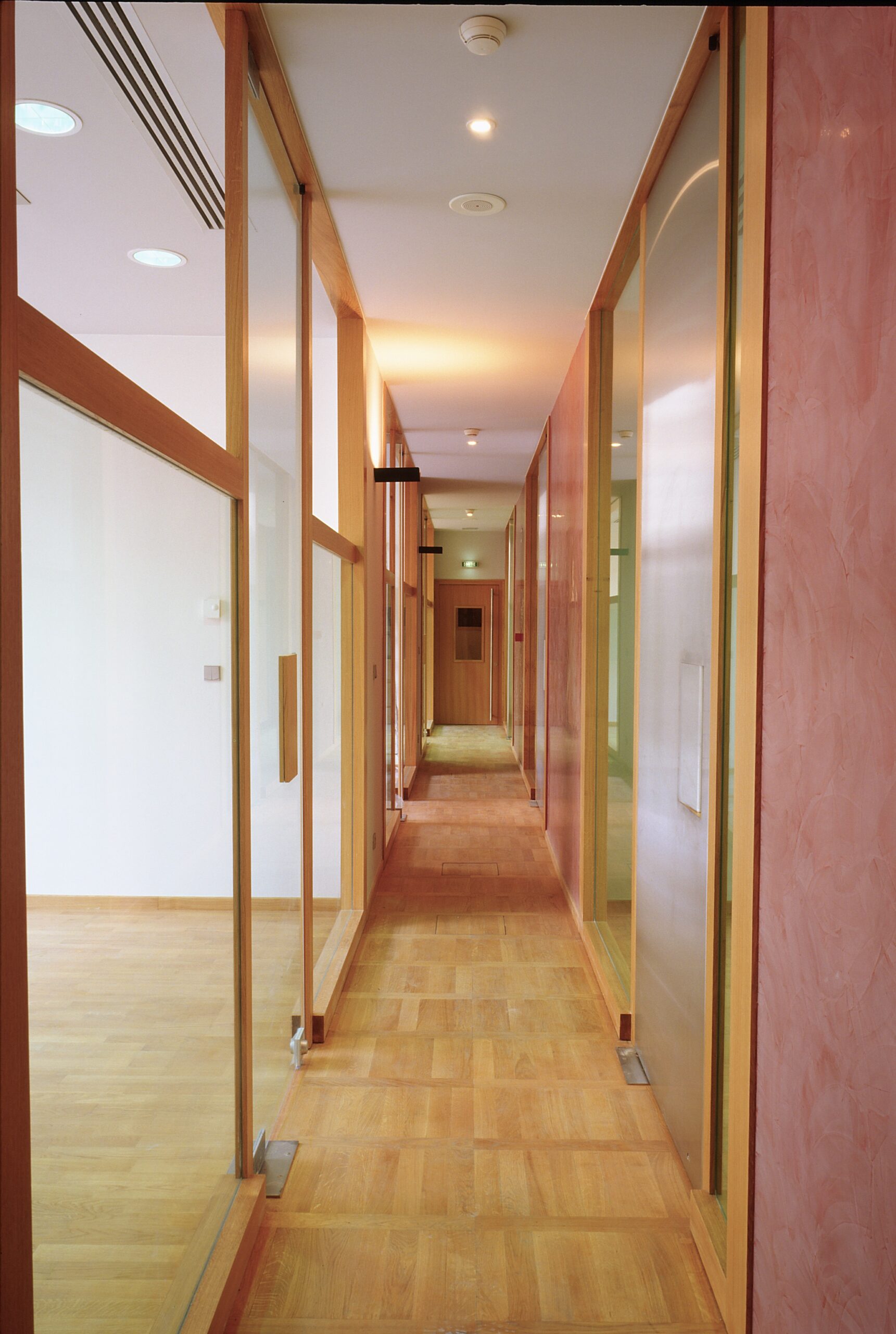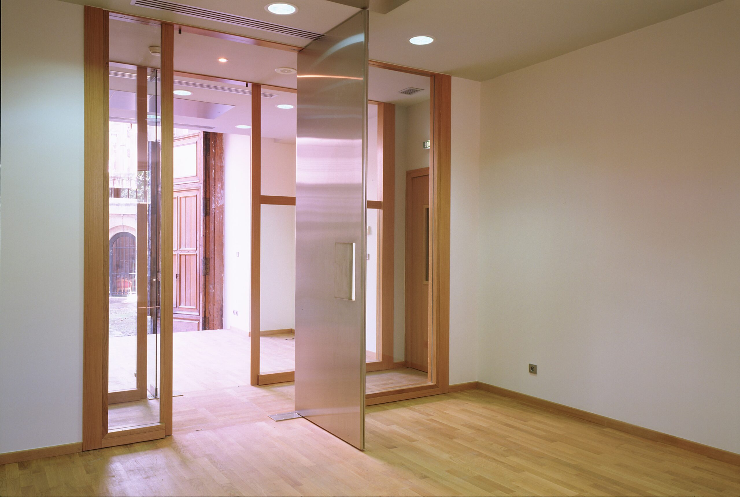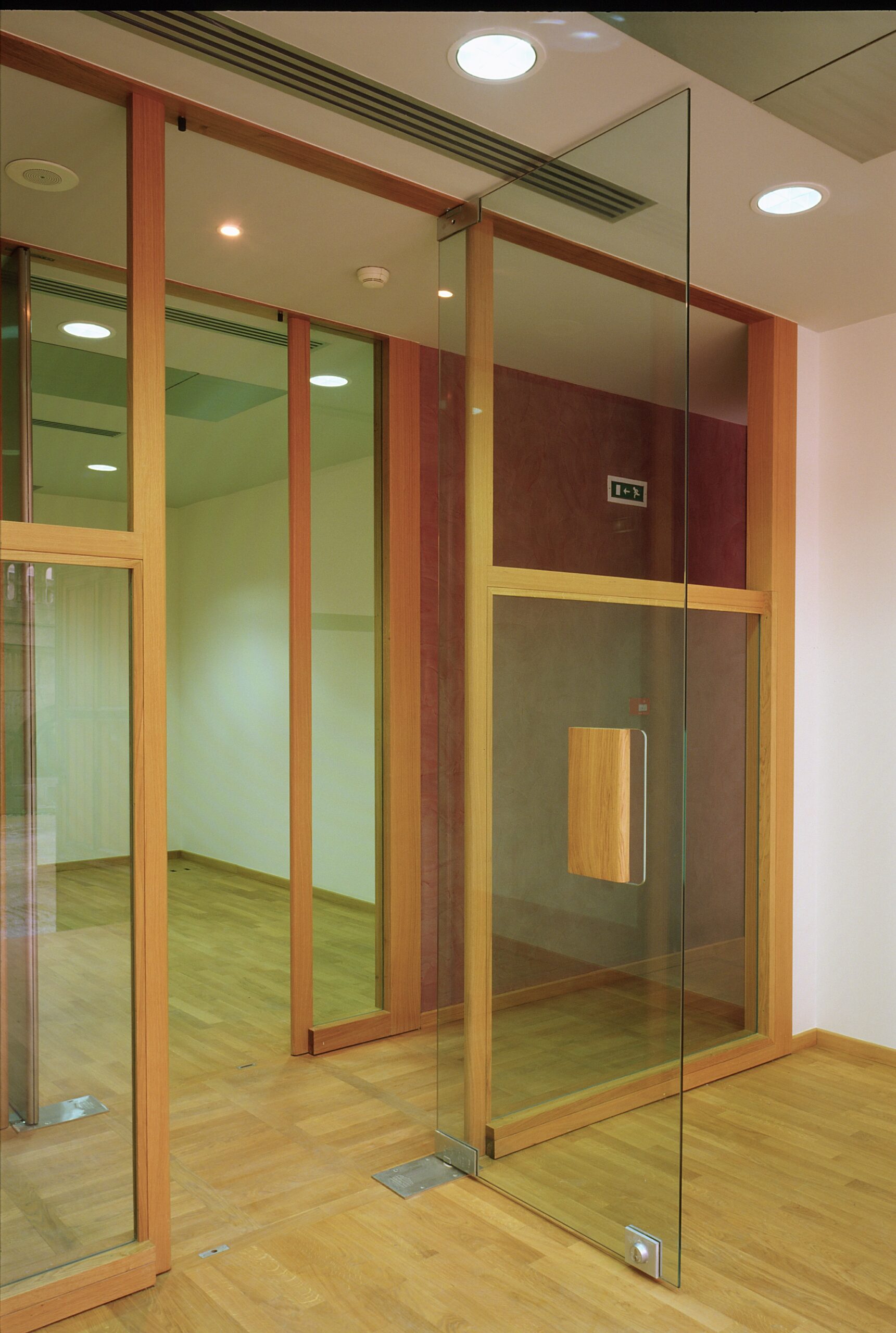 Dans le cadre d’un programme élaboré par l’EPGL à partir de 1991 pour l’aménagement de plusieurs services du musée du Louvre dans l’aile Denon sous la Grande Galerie, la bibliothèque constituait une seconde tranche de travaux après l’aménagement du service des travaux muséographiques (TRAMU) sur la cour Lefuel (1996-1998), et préalablement à l’aménagement des bureaux des conservations AGER et AO sur la cour Visconti (1998-2004). Située de part et d’autre du porche Lefuel, la bibliothèque s’organise dans des espaces relativement sombres et hauts de plafond, le long du « saut du loup » côté Seine et sur la cour Lefuel. Le projet aménage des espaces de travail ouverts, dans l’esprit d’un plateau paysagé avec des cloisons pleines ou vitrées de hauteur réduite et dont les portes, souhaitées par les utilisateurs pour la sécurisation des documents en dehors des heures d’occupation, n’ont pas de rôle acoustique. Ces portes sont alternativement en verre ou en aluminium, leurs poignées ont fait l’objet de prototype au moment du chantier, à partir d’un dessin précis qui intègre la « prise de main » dans toute l’épaisseur et la matière de l’ouvrage.