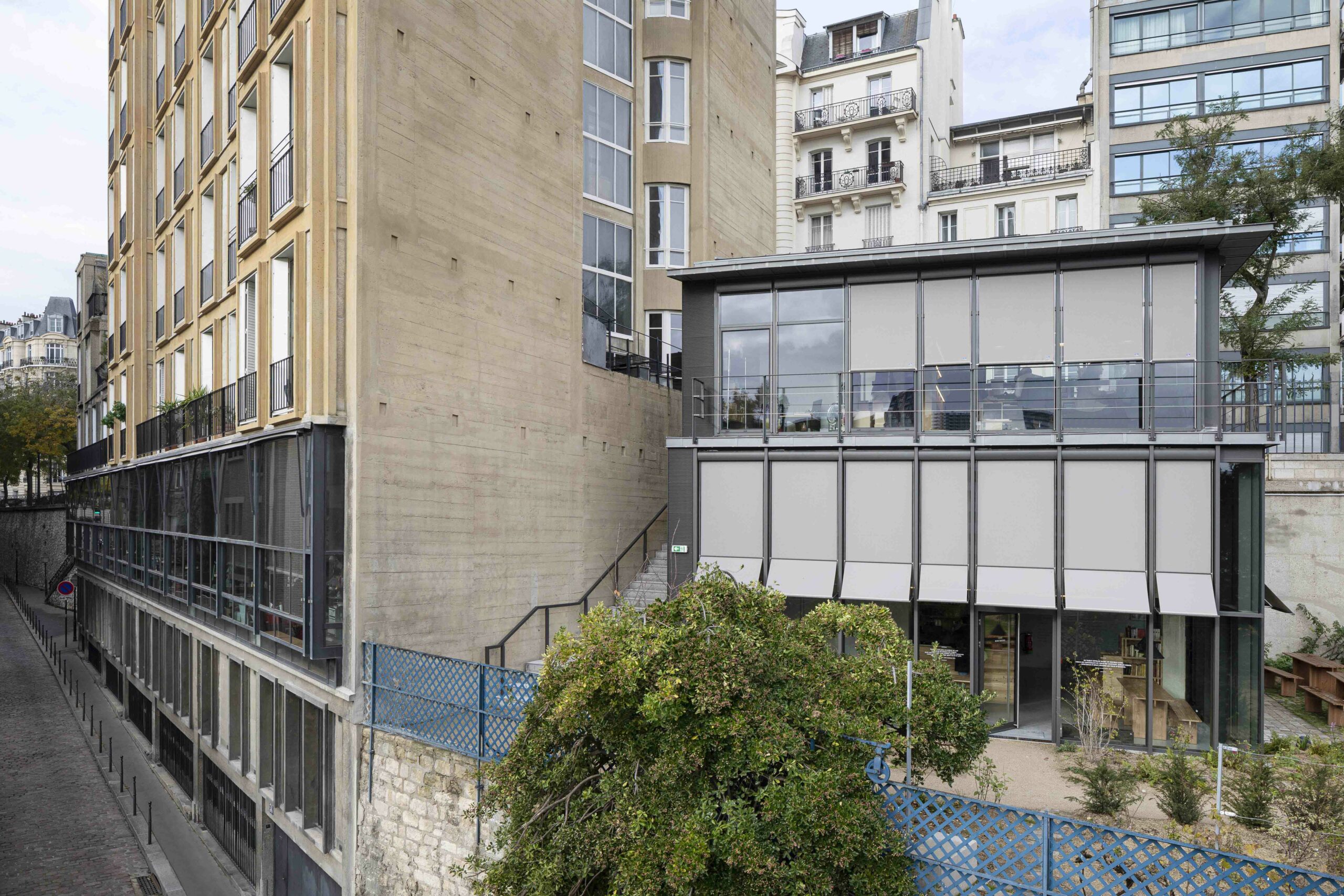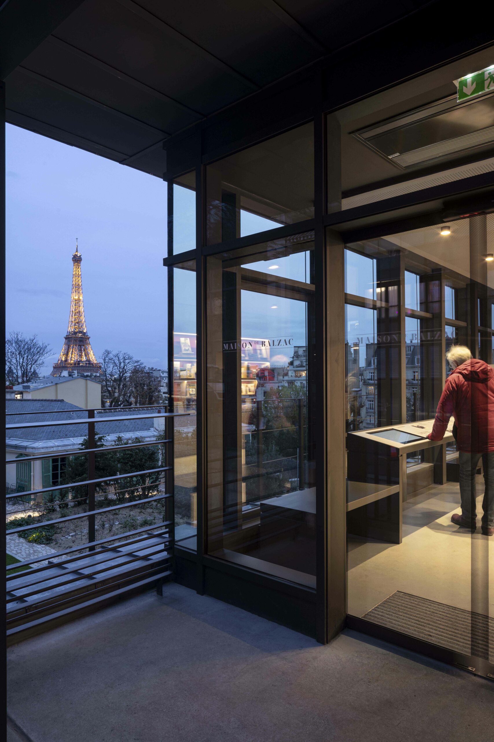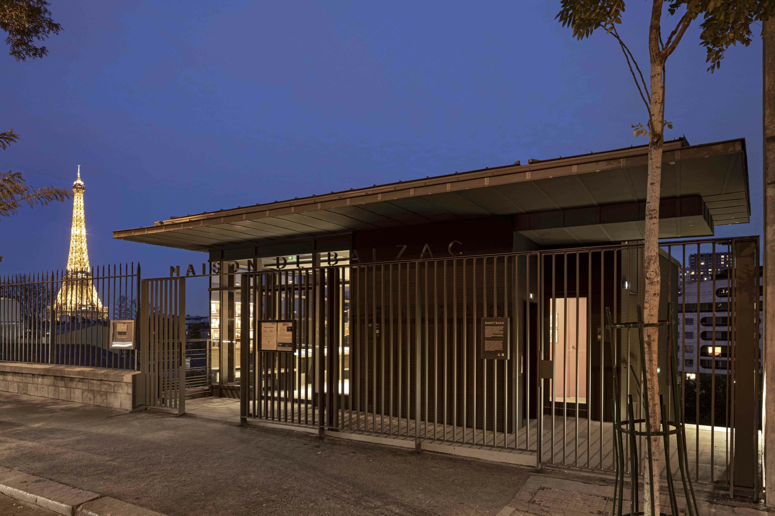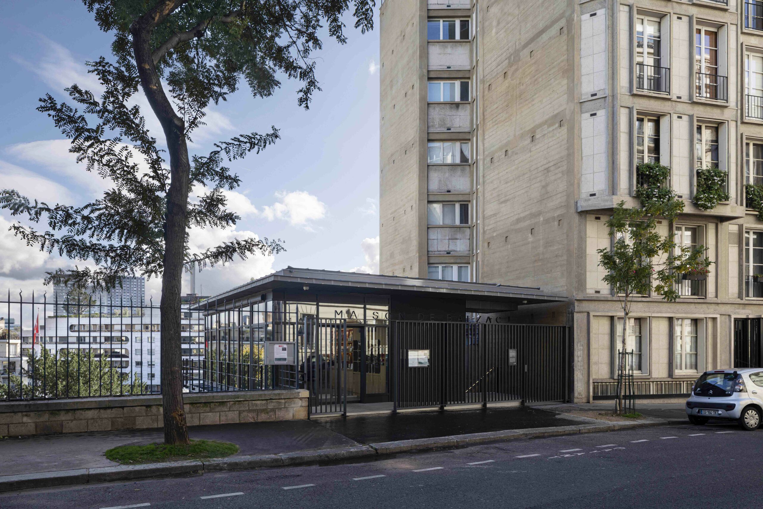 Au 47 de la rue Raynouard dans un site exceptionnel et un contexte patrimonial sensible, entre la maison et son jardin classés Monuments Historiques, jardin classé également « Espace Vert Protégé » au PLU sur 650 m2, l’immeuble d’Auguste Perret construit en 1930 inscrit à l’inventaire MH, le projet du bâtiment d’accueil s’est inspiré à cet endroit, côté rue Berton, de cette façade de métal et de verre de l’agence Perret enchâssée au 1er étage de l’immeuble d’habitation et ses modénatures de béton. Le nouveau bâtiment a permis la mise en accessibilité du site de la maison de Balzac nichée sur le coteau de Passy dans le 16ème arrondissement. Un ascenseur public dessert trois niveaux : l’accueil sur la rue, les espaces de repos du personnel à l’entresol, le café au niveau du jardin et de la maison, en balcon sur Paris. Le nouvel escalier extérieur public se glisse entre le bâtiment d’accueil et l’imposant pignon de l’immeuble Perret ; il relie directement la rue et le jardin, et permet en arrivant en bas de redécouvrir la maison cachée dans son environnement végétal « domestique » rénové.
