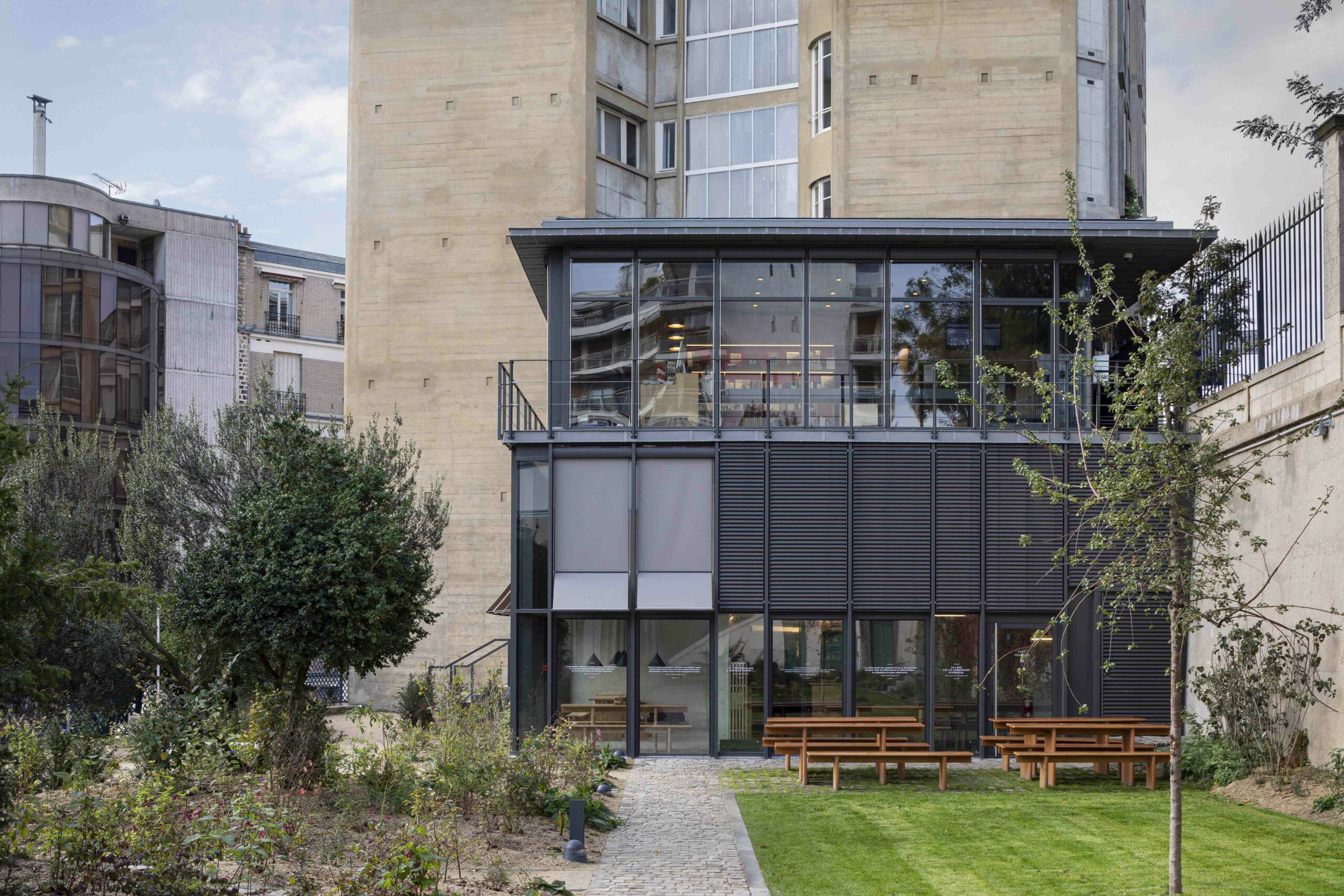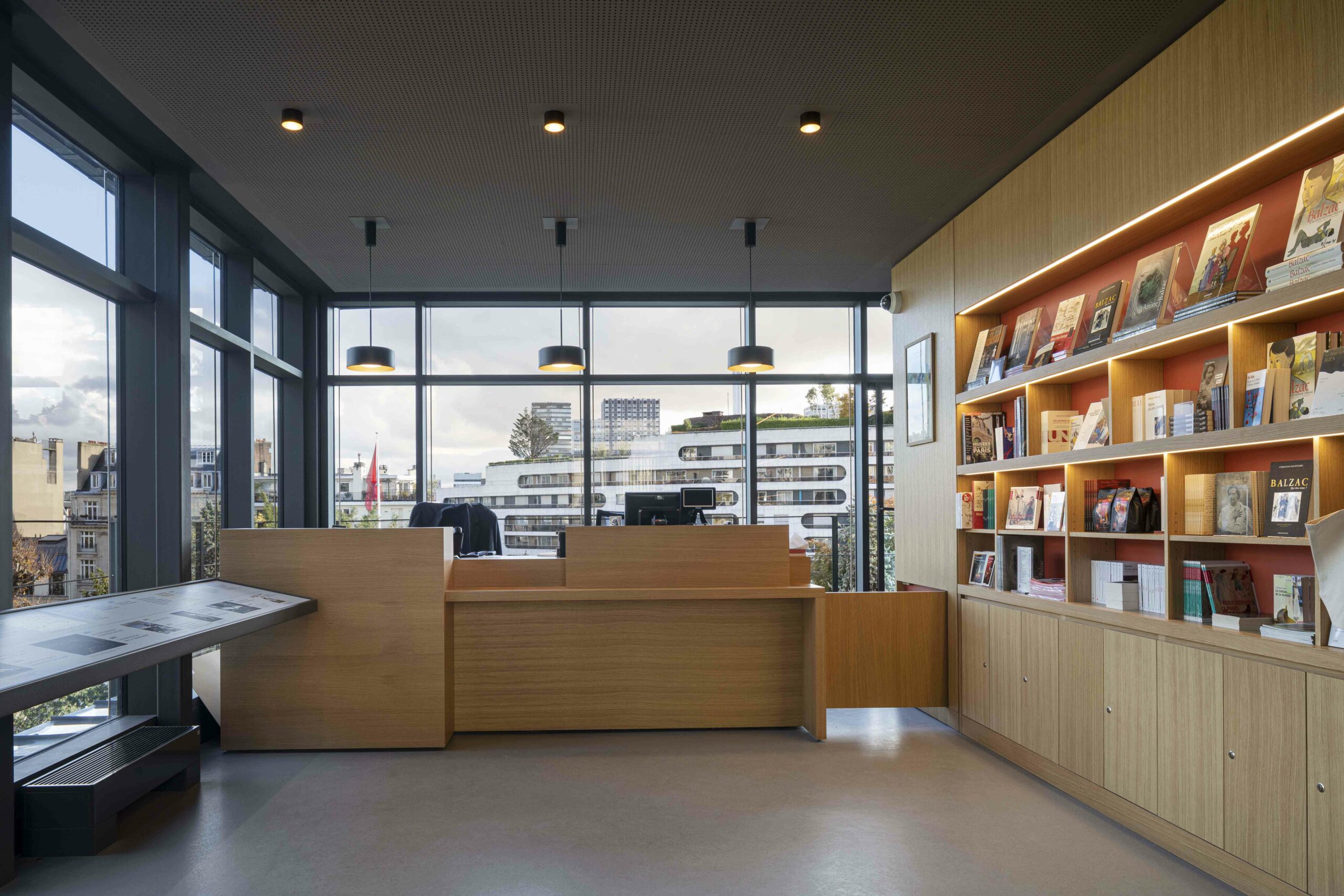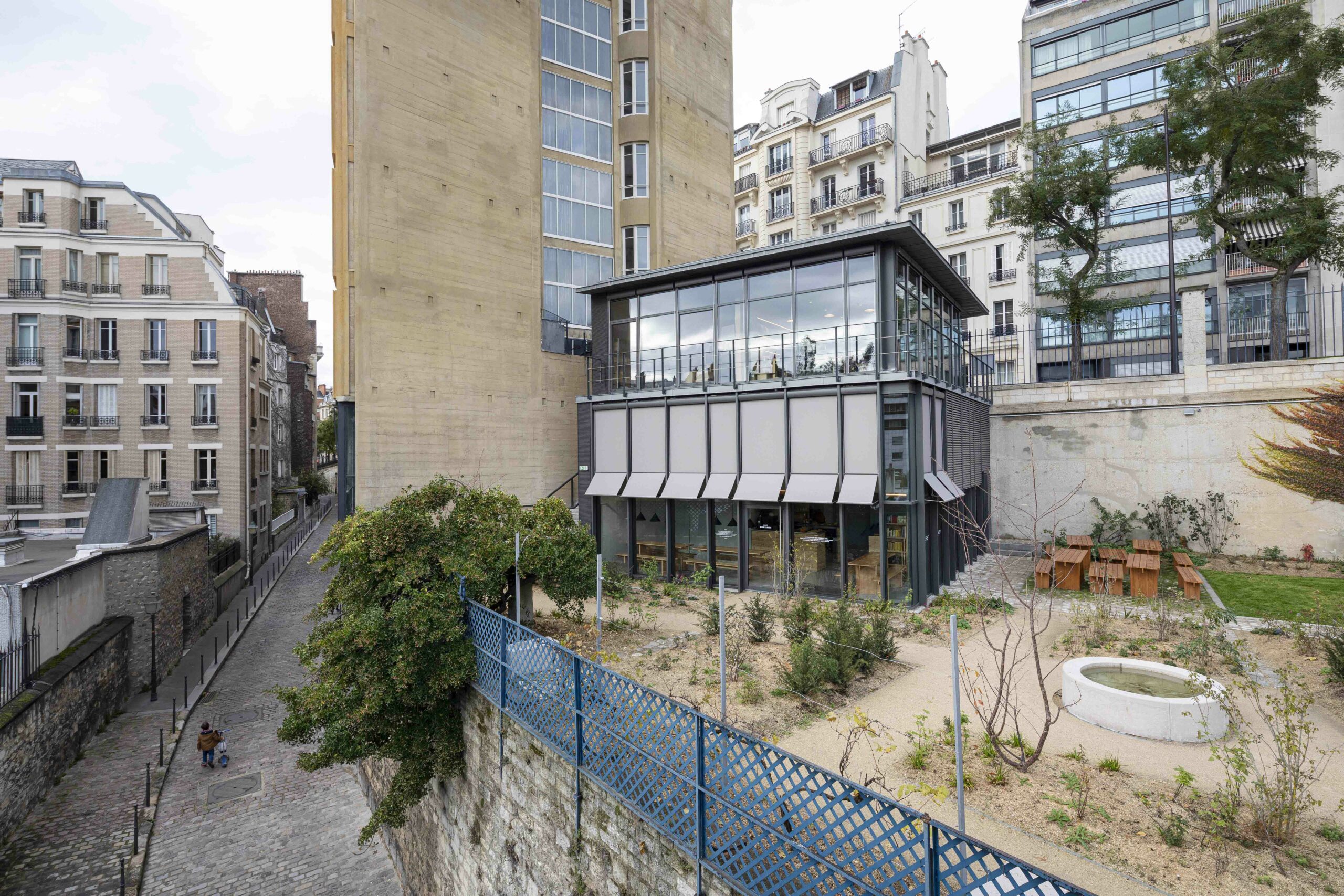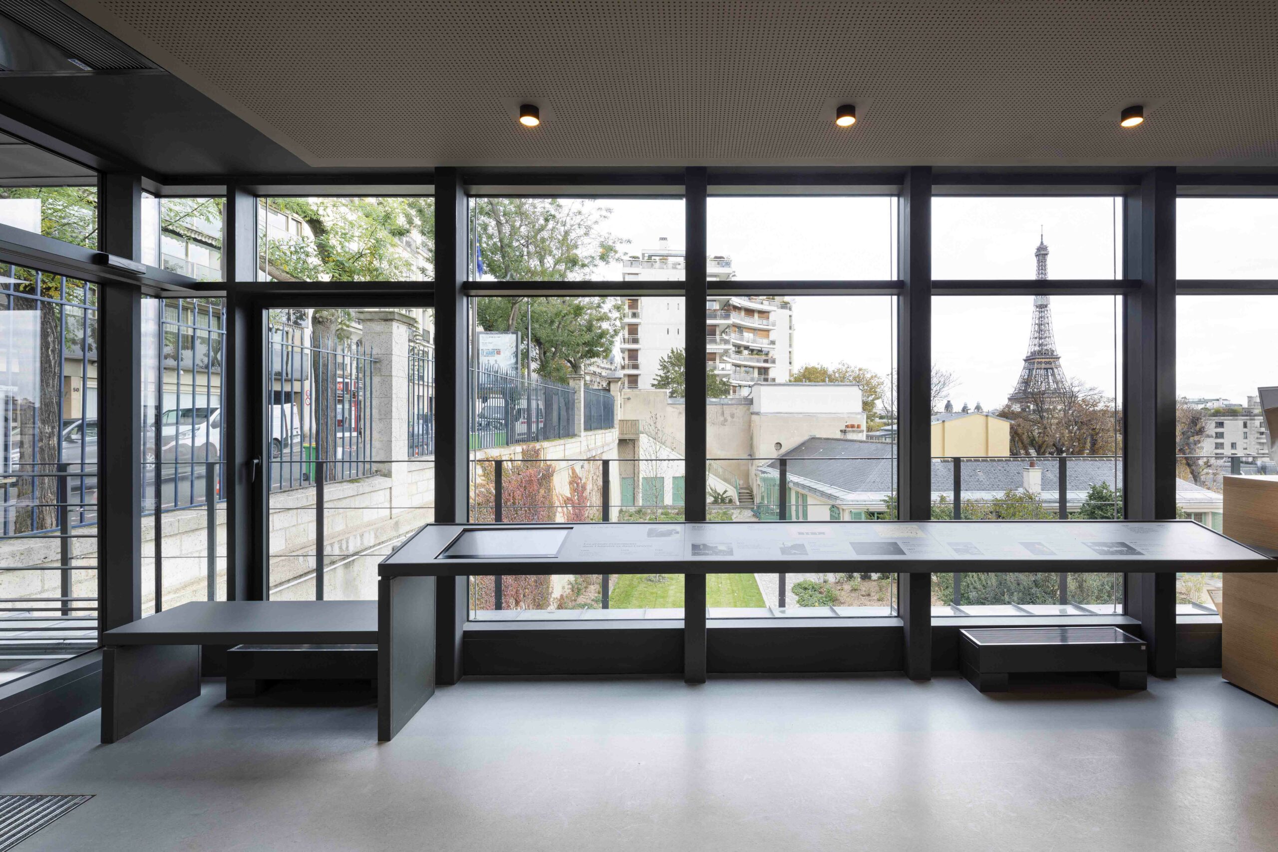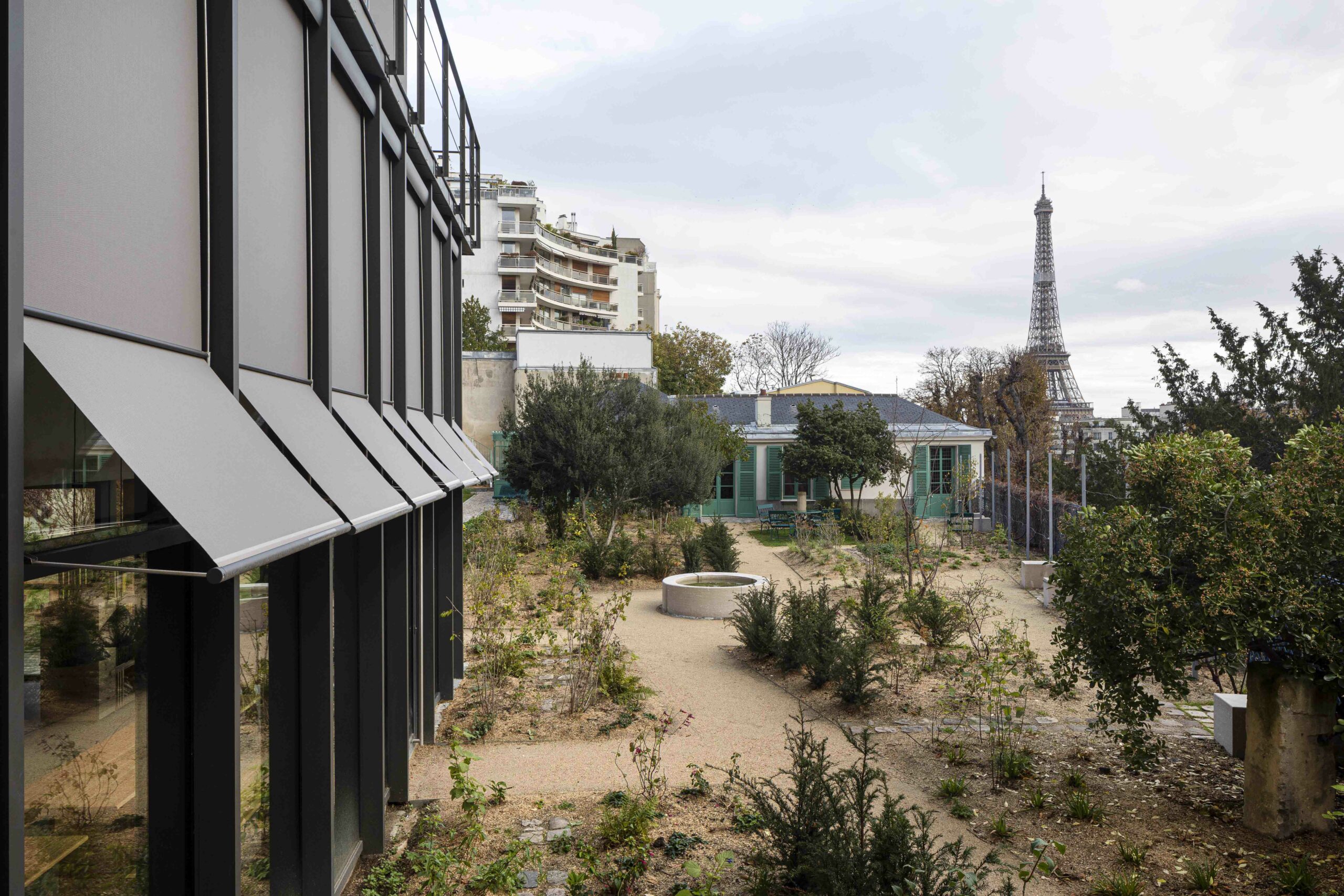 Au 47 de la rue Raynouard dans un site exceptionnel et un contexte patrimonial sensible, entre la maison et son jardin classés Monuments Historiques, jardin classé également « Espace Vert Protégé » au PLU sur 650 m2, l’immeuble d’Auguste Perret construit en 1930 inscrit à l’inventaire MH, le projet du bâtiment d’accueil s’est inspiré à cet endroit, côté rue Berton, de cette façade de métal et de verre de l’agence Perret enchâssée au 1er étage de l’immeuble d’habitation et ses modénatures de béton. Le nouveau bâtiment a permis la mise en accessibilité du site de la maison de Balzac nichée sur le coteau de Passy dans le 16ème arrondissement. Un ascenseur public dessert trois niveaux : l’accueil sur la rue, les espaces de repos du personnel à l’entresol, le café au niveau du jardin et de la maison, en balcon sur Paris. Le nouvel escalier extérieur public se glisse entre le bâtiment d’accueil et l’imposant pignon de l’immeuble Perret ; il relie directement la rue et le jardin, et permet en arrivant en bas de redécouvrir la maison cachée dans son environnement végétal « domestique » rénové.