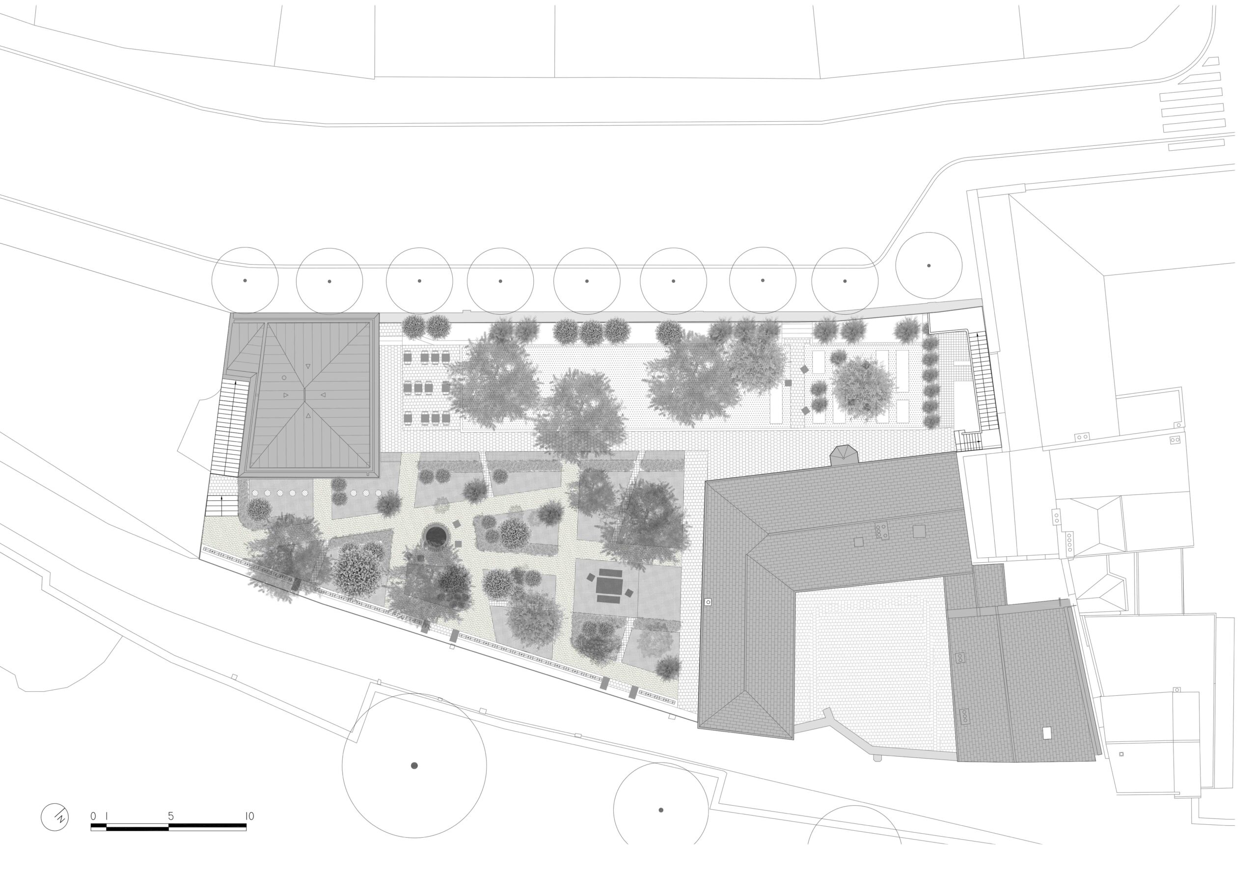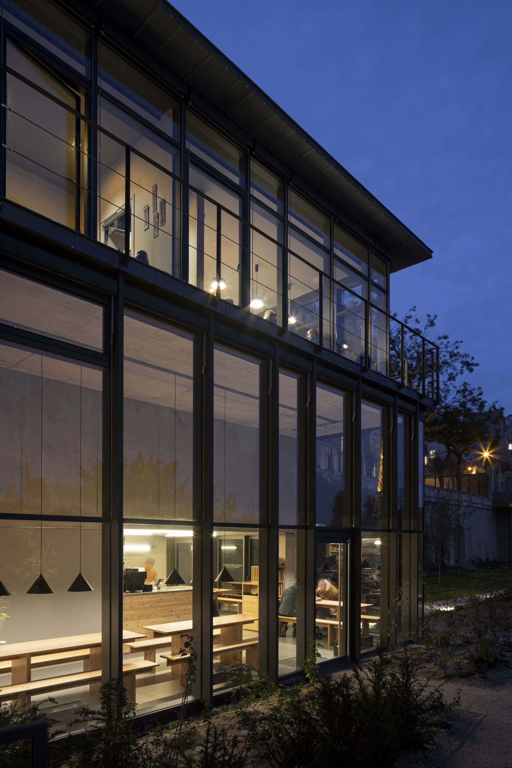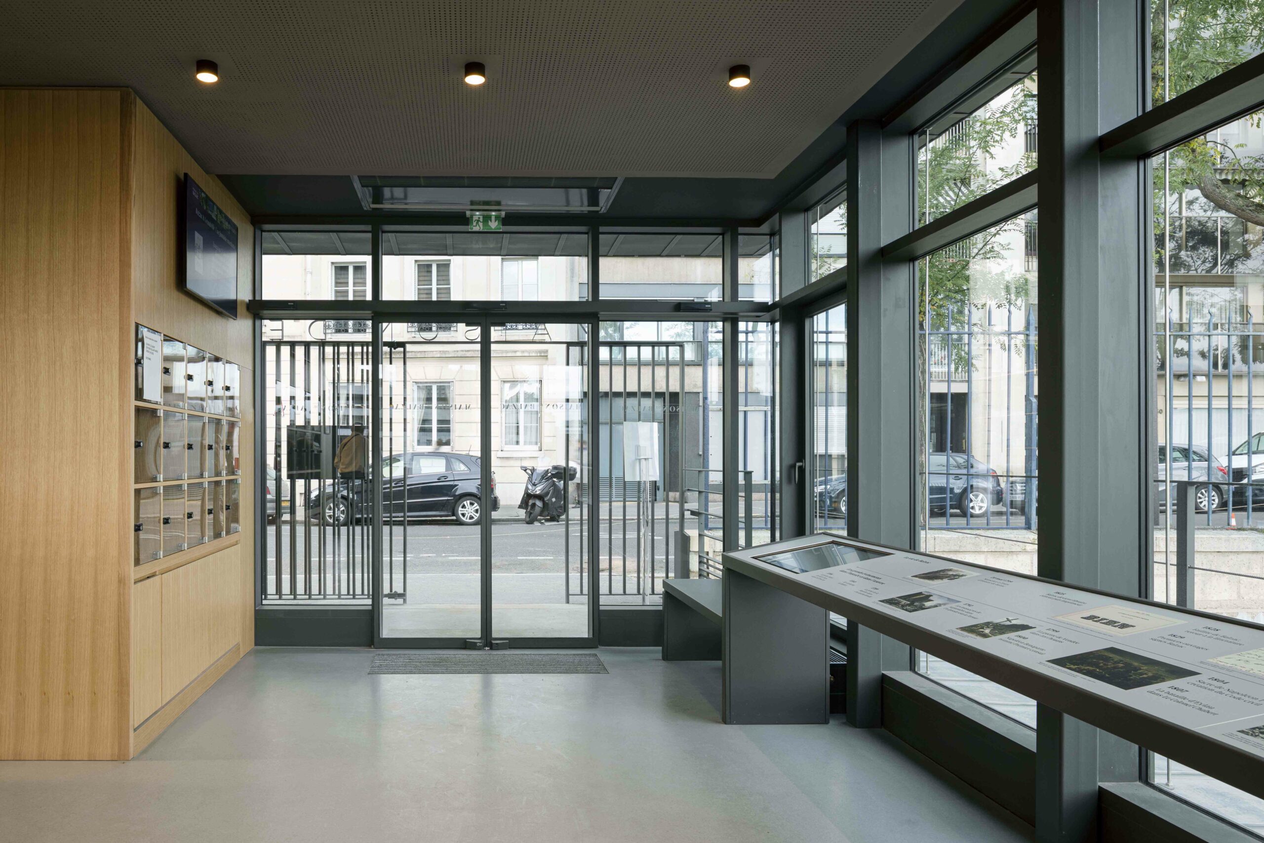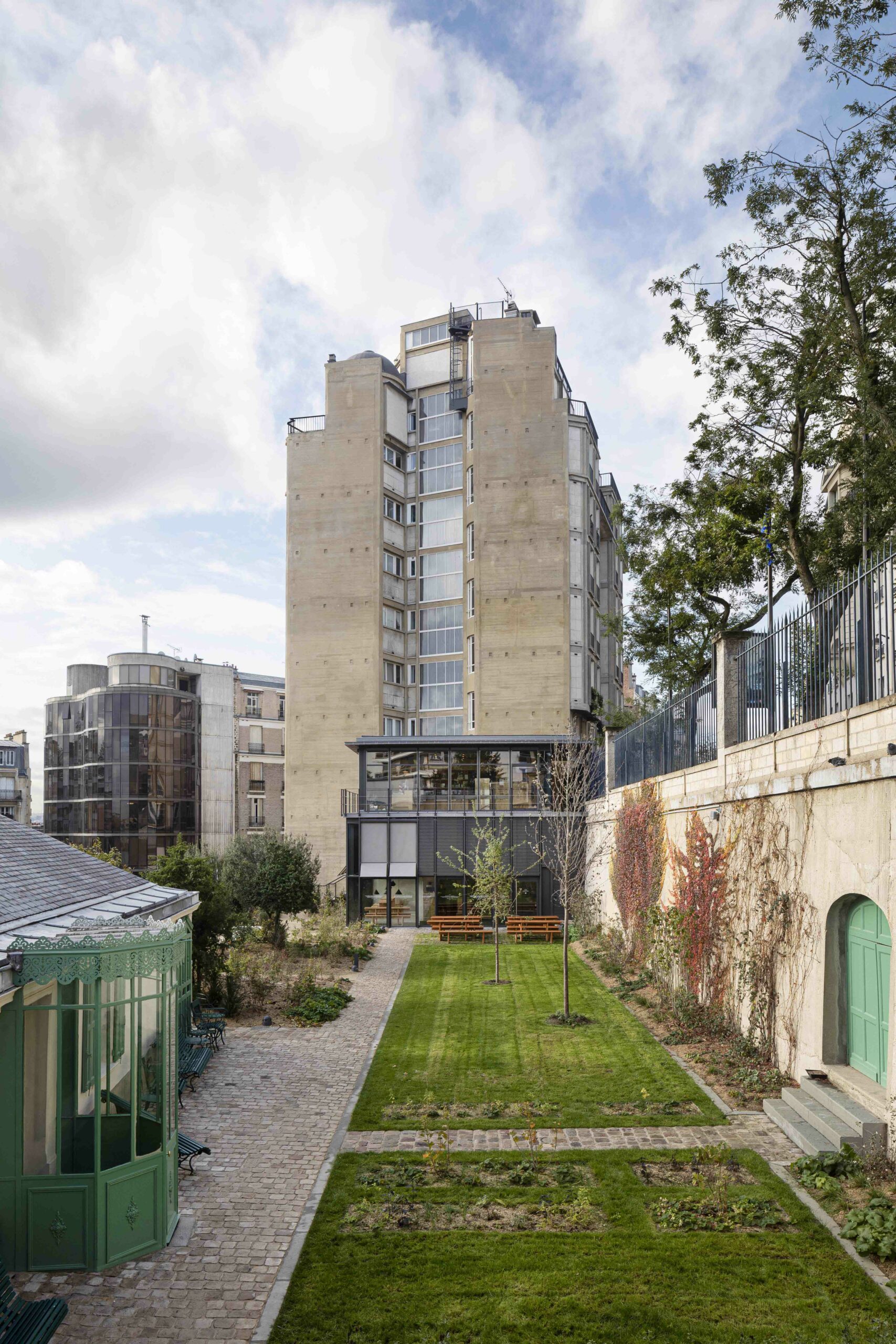 Au 47 de la rue Raynouard dans un site exceptionnel et un contexte patrimonial sensible, entre la maison et son jardin classés Monuments Historiques, jardin classé également « Espace Vert Protégé » au PLU sur 650 m2, l’immeuble d’Auguste Perret construit en 1930 inscrit à l’inventaire MH, le projet du bâtiment d’accueil s’est inspiré à cet endroit, côté rue Berton, de cette façade de métal et de verre de l’agence Perret enchâssée au 1er étage de l’immeuble d’habitation et ses modénatures de béton. Le nouveau bâtiment a permis la mise en accessibilité du site de la maison de Balzac nichée sur le coteau de Passy dans le 16ème arrondissement. Un ascenseur public dessert trois niveaux : l’accueil sur la rue, les espaces de repos du personnel à l’entresol, le café au niveau du jardin et de la maison, en balcon sur Paris. Le nouvel escalier extérieur public se glisse entre le bâtiment d’accueil et l’imposant pignon de l’immeuble Perret ; il relie directement la rue et le jardin, et permet en arrivant en bas de redécouvrir la maison cachée dans son environnement végétal « domestique » rénové.